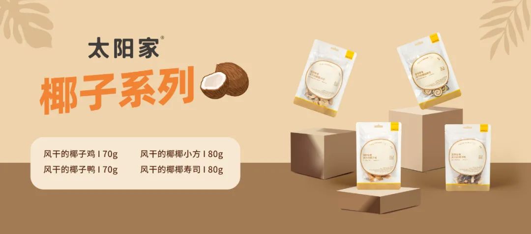 2022年太阳家经过长达半年时间的品牌升级准备之后,推出了首个系列新品“椰子系列”。太阳家椰子系列宠物零食使用海南岛果肉醇厚的毛椰为主要原料,严选正宗海南椰肉,通过椰子+肉的新奇组合,使用低温热风循环干燥工艺,打造出颜值与美味并存的宠物零食。