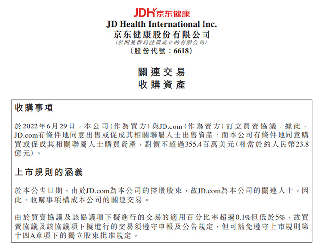 6月29日,京东健康发布公告称,公司与京东集团订立买卖协议,据此,京东集团有条件地同意出售或促成其相关联属人士出售资产,而公司有条件地同意购买或促成其相关联属人士购买资产,对价不超过3.554亿美元(约人民币23.8亿元)。据了解,京东健康收购京东集团资产事项与宠物健康产品品类相关,公告显示,主要包括宠物处方药/处方粮、宠物营养品、宠物驱虫、宠物奶粉、宠物口耳眼清洁等类别的宠物健康相关产品的合同、存货和经营权。