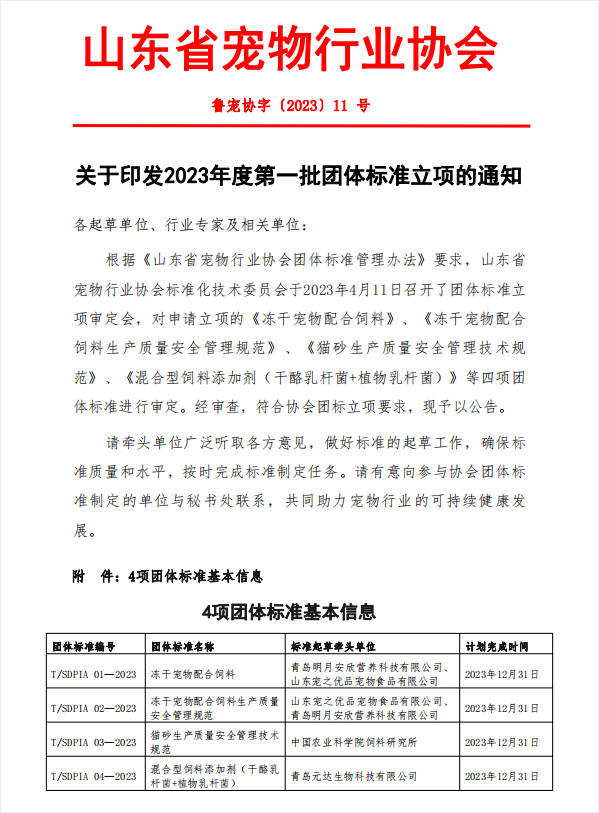 山东省宠物行业协会近日发布《关于印发2023年度第一批团体标准立项的通知》,根据《山东省宠物行业协会团体标准管理办法》要求,山东省宠物行业协会标准化技术委员会于2023年4月11日召开了团体标准立项审定会,对申请立项的《冻干宠物配合饲料》、《冻干宠物配合饲料生产质量安全管理规范》、《猫砂生产质量安全管理规范》、《混合型饲料添加剂(干酪乳杆菌+植物乳杆菌)》等四项团体标准进行审定。经审查,符合协会团标立项要求,现予以公告。请牵头单位广泛听取各方意见,做好标准的起草工作,确保标准质量和水平,按时完成标准制定任务。请有意向参与协会团体标准制定的单位与秘书处联系,共同助力宠物行业的可持续健康发展。
