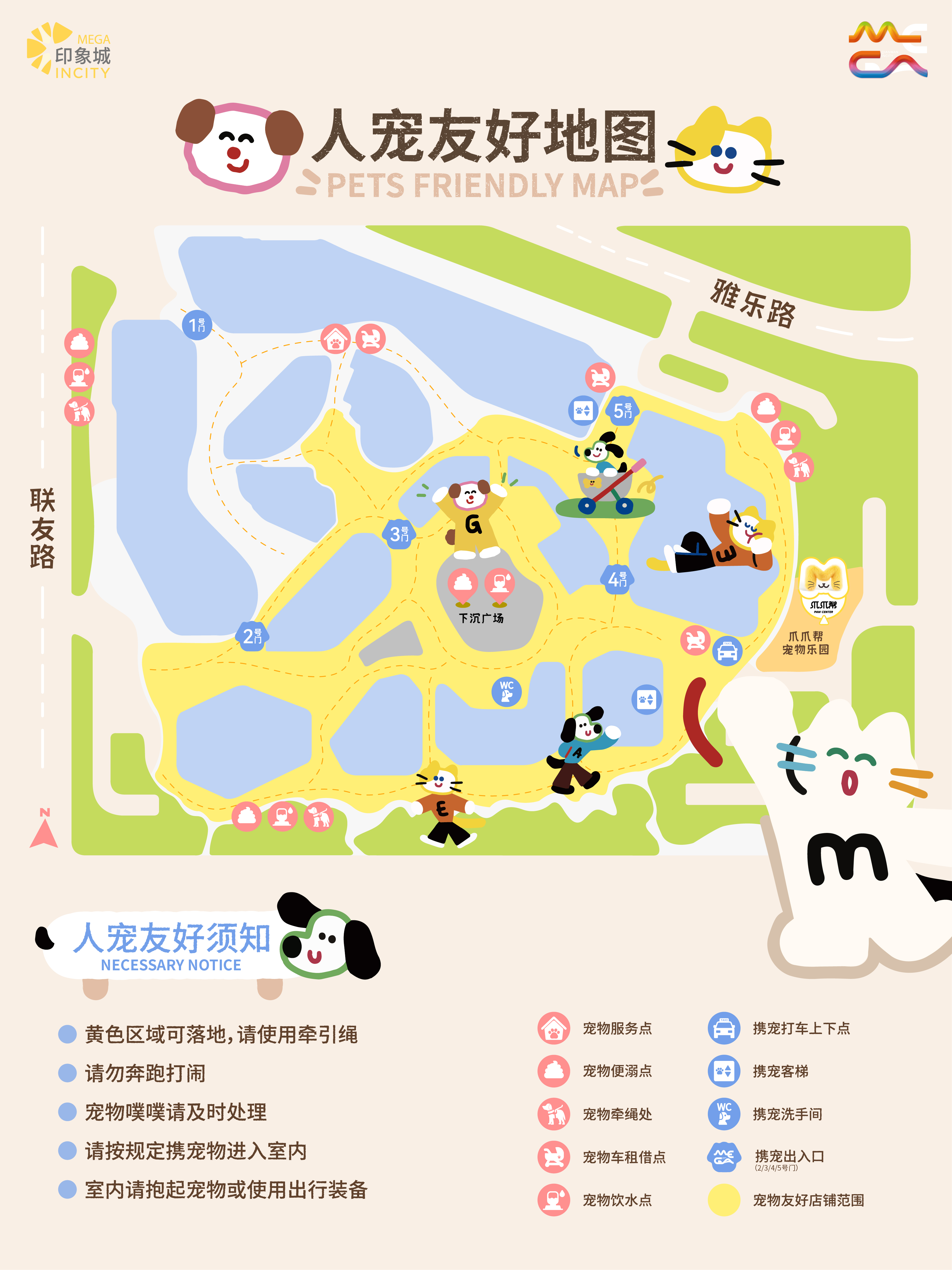 在硬件配置上,上海虹桥前湾印象城MEGA系统布局人宠落客区、萌宠乐园、人宠友好洗手间、人宠共乘电梯、宠物推车、宠物饮水点、牵绳处、便溺点等基础设施,并配套完善的软性服务,与已引入的宠物友好品牌形成有效协同。为深化“人宠友好”概念,项目注重平衡养宠人士与非养宠人群的不同需求,通过明确划分宠物活动区与非宠物活动区,设置缓冲空间与行为指引,营造和谐共处的公共环境。