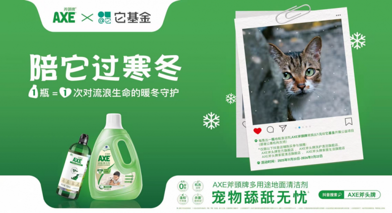 此次合作体现了品牌专业能力与社会公益需求的深度契合,也是AXE斧頭牌“超A洁净力,安心又欢洗”品牌理念在社会公益领域的自然延伸。基于对一线救助机构痛点的深入洞察,AXE斧頭牌将其在家清领域的安全标准与专业能力延伸至公益场景。捐赠的地板清洁剂通过急性经口无毒测试,具备“宠物舔舐无忧”级别的安全性,能有效杀菌并根源祛味,为流浪动物营造洁净健康的过冬环境。