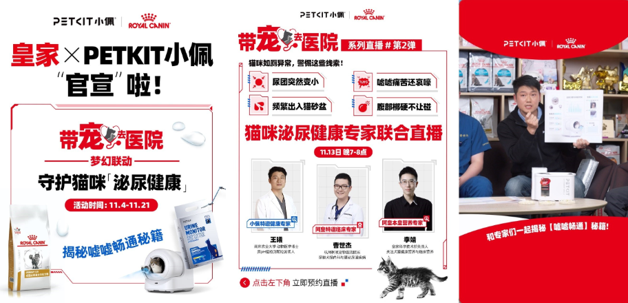 与此同时,皇家携手宠物智能用品品牌PETKIT小佩,聚焦宠物泌尿健康痛点,首次打造品牌守护猫咪泌尿健康联合社群。双方整合彼此在精准营养与智能科技领域的优势,深入泌尿健康问题具体场景,共同打造了“从疾病预防到日常养护”的一站式、场景化教育内容体系。双方以专场直播、社群问诊等形式,重塑了居家环境下宠物泌尿道健康的管理新范式,将泌尿健康管理前置并融入日常。本次合作共吸引上千名宠主参与社群互动及直播。