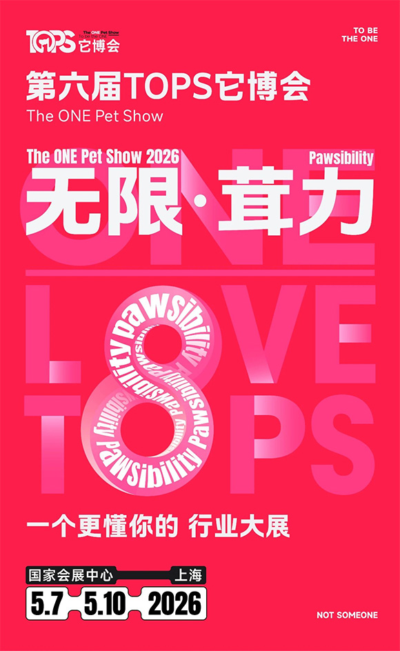 2026第6届TOPS它博会将于5月7-10日在上海国家会展中心举办。第6届它博会的主题定为【PAWSibility】:PAWSibility = PAWS(爪印)+ Ability(能力), 宠物与生俱来的独特天赋和潜能多样性。PAWSibility音同“Possibility”, 宠物的能力无边界,充满可探索的未来惊喜。