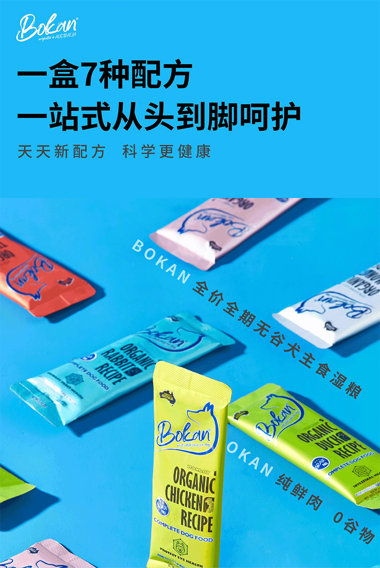 Bokan博刻全价全期无谷犬主食湿粮,来自澳洲的主食湿粮,每日鲜食,七种配方。